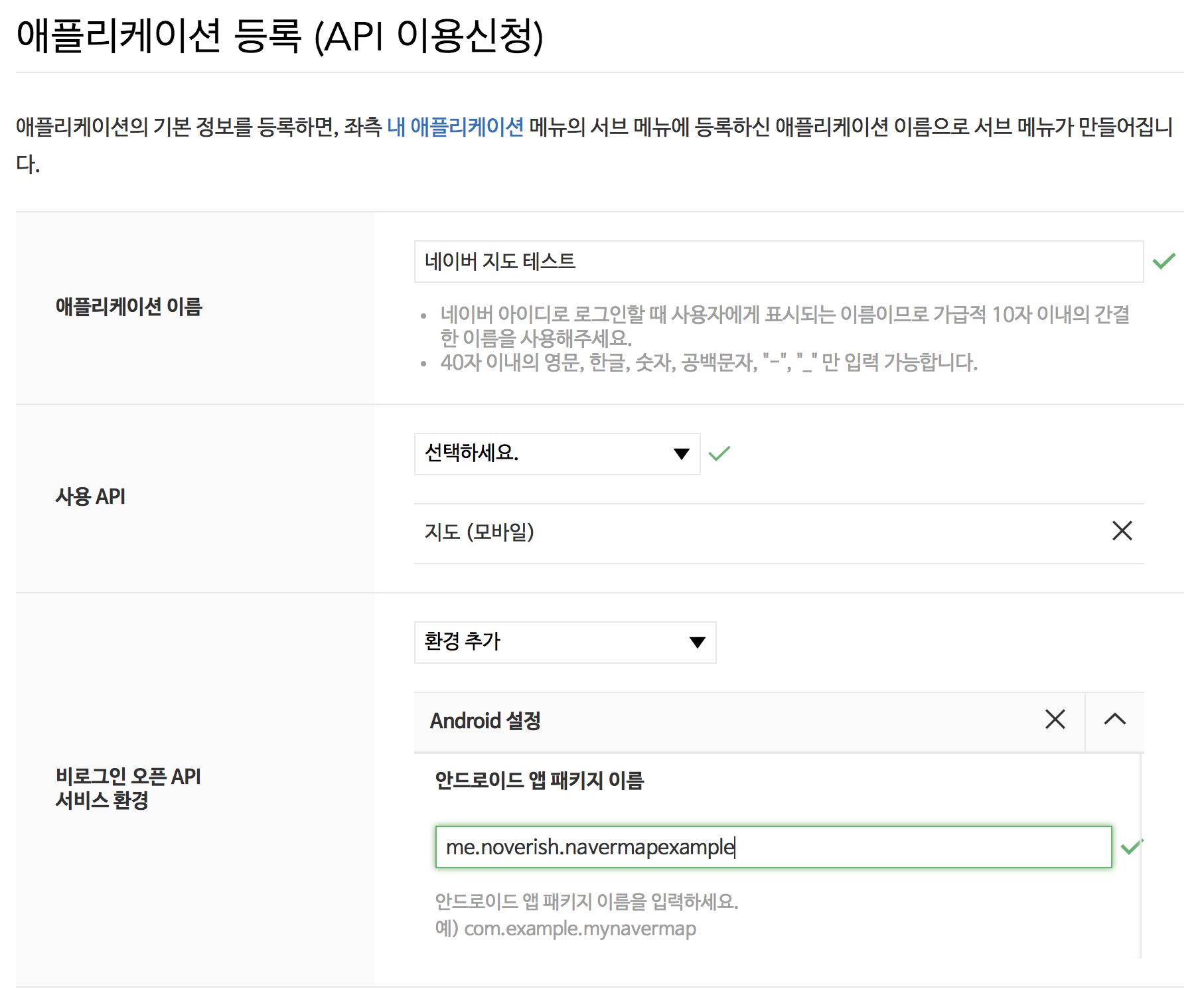 어플리케이션 이름은 실제 사용자들이 보게 될 서비스 이름입니다. 뭐 우리는 이 앱을 실제로 서비스하지 않으므로 적당히 입력합니다. 사용 API에서 지도(모바일)을 선택하고 Android 환경을 추가한 뒤 안드로이드 앱 패키지 이름을 입력한 뒤 등록합니다.
