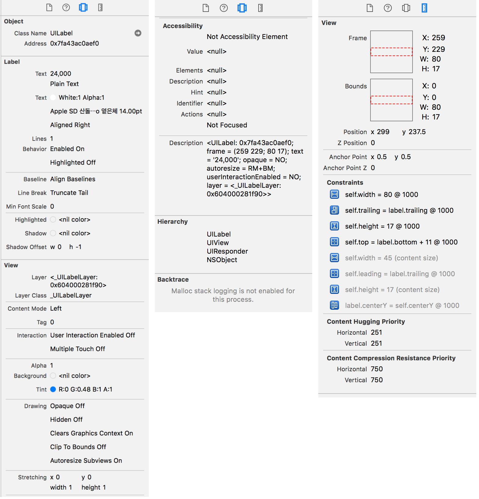 각각의 View 들의 Property, Size, Position 등을 확인할 수 있다.